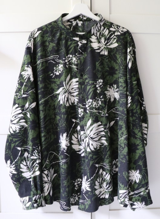 Il s’agit toujours du modèle n°128 du magazine Burda de juillet 2019 : une chemise de forme légèrement liquette avec plastron boutonné au devant, col mao, manches longues finies par des parements et poignets de manche.