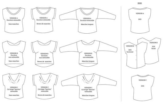Ce patron, on ne le présente plus, tellement il a été cousu et recousu par toute la blogosphère couture ! Voici tout de même le schéma technique et les versions proposées :