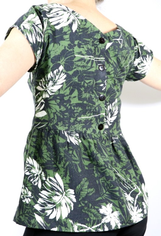 Pour cette version, j’ai décidé de coudre la version dos boutonnée et d’ajouter une basque froncée. Option proposée dans le livret d’explications.