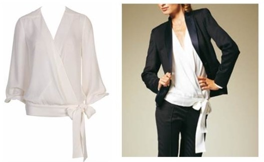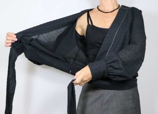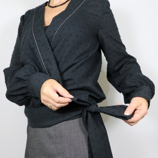 C’est une blouse cache-coeur qui se noue sur le côté par de longs et larges liens. Le décolleté est vertigineux et nécessite le port d’un débardeur en dessous. Les manches longues sont légèrement bouffantes et resserrées par un poignet boutonné.