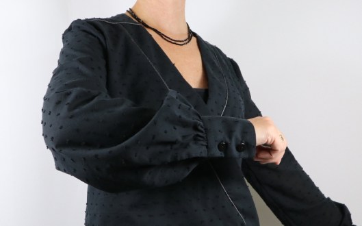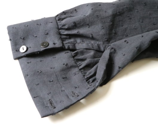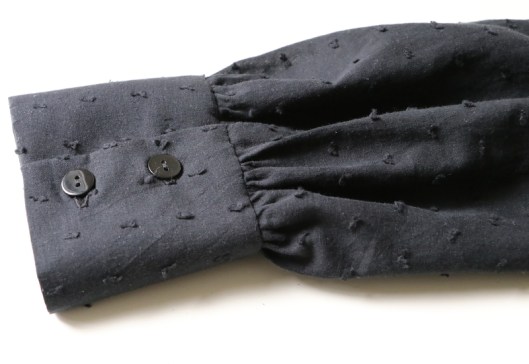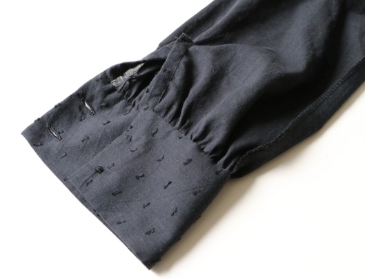 Les manches longues sont bouffantes : elles sont froncées et resserrées par un poignet boutonné. C’est un détail féminin que je trouve absolument charmant.