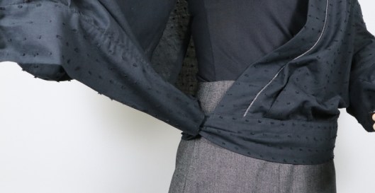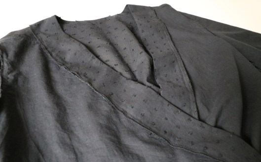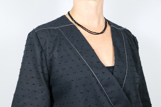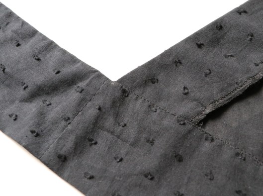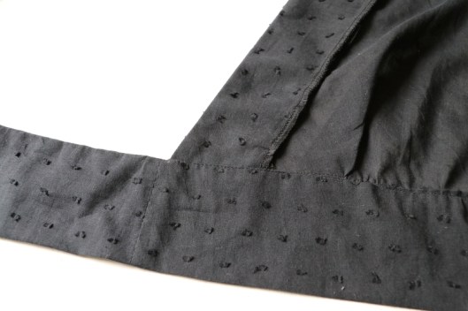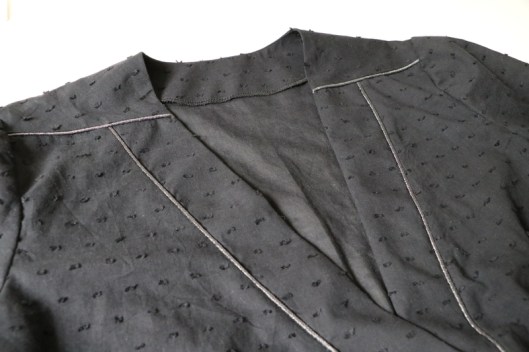 Côté finitions, il s’agit de parementures devant et dos. Je n’ai pas fait de sous-piqûres mais j’ai maintenu les parementures devant par des points à la main (glaçage).