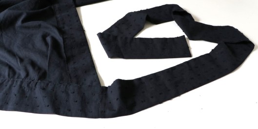Il n’y a pas de cran/repère d’assemblage pour positionner la ceinture au devant, j’ai donc décidé de faire coïncider la couture de la ceinture avec l’extrémité du devant :