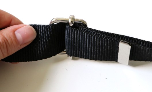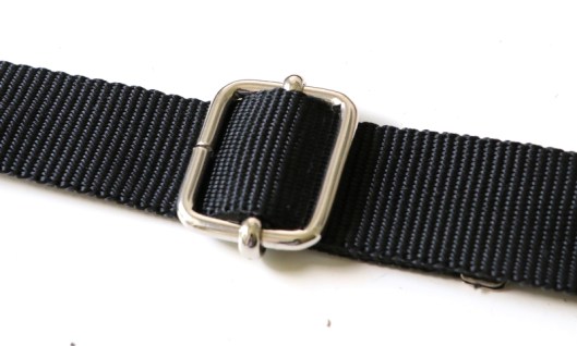 Celle-ci est réalisée dans une sangle (achetée chez Modes & Travaux / Saint-Lazare) que l’on peut régler grâce à la boucle fournie dans le kit :