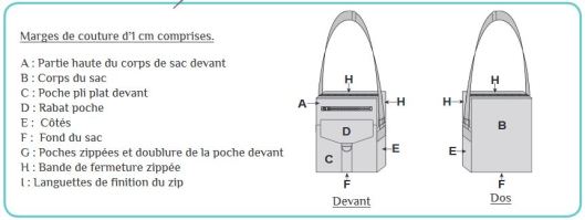 Pour info, voici les dimensions : largeur 18 cm x hauteur 22 cm x profondeur 7 cm. Le schéma technique (comme d’habitude, les valeurs de couture sont comprises) :