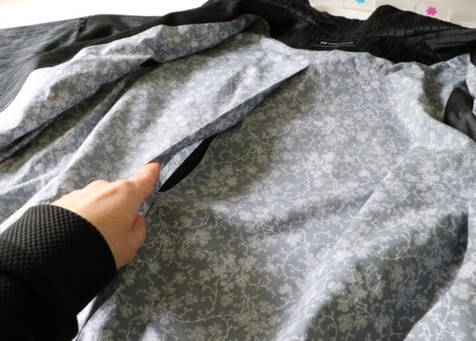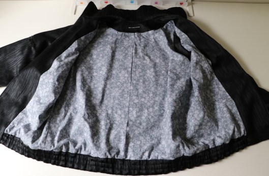 Comme vous le savez, pour retourner sur l’endroit une veste doublée, on laisse toujours une ouverture quelque part. En général, elle se trouve dans une manche ou en bas de la veste. Ici, l’ouverture est placée dans le pli d’aisance du milieu dos et j’ai bien aimé cette idée.