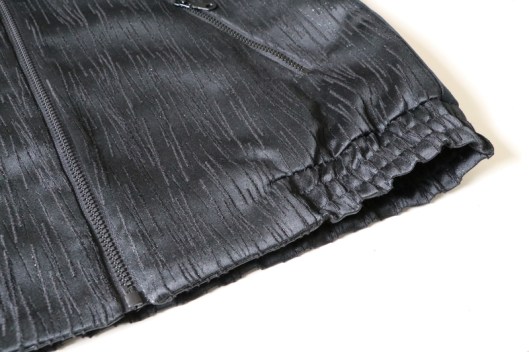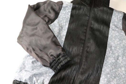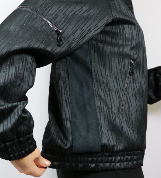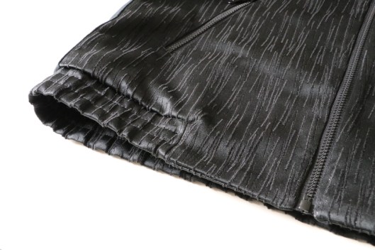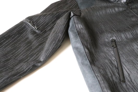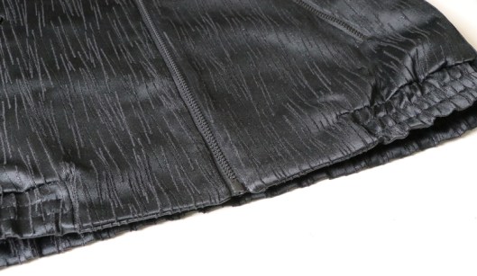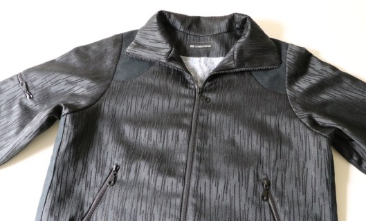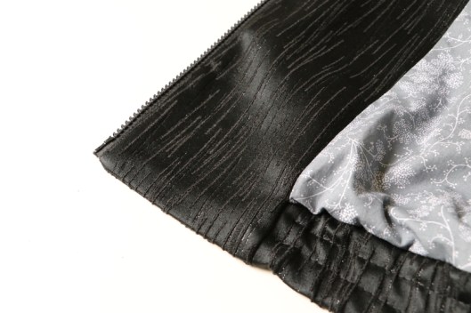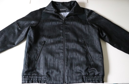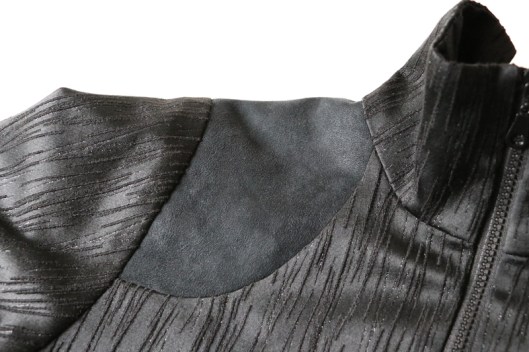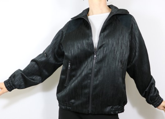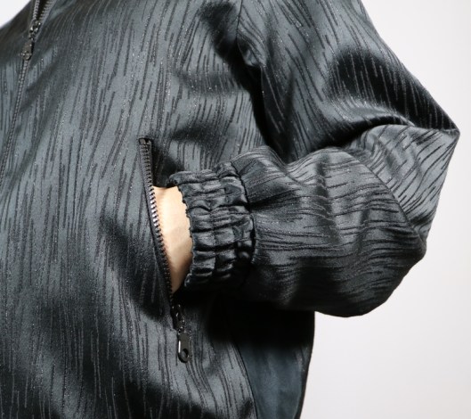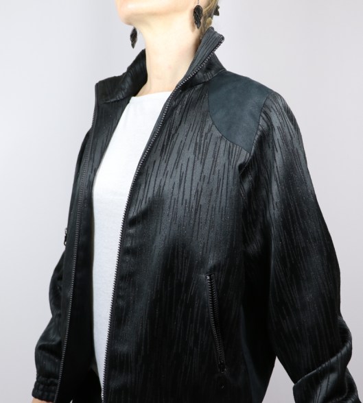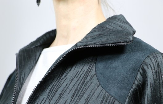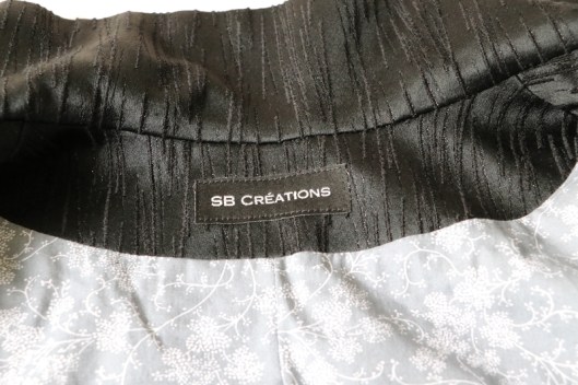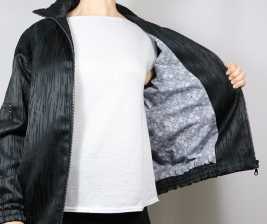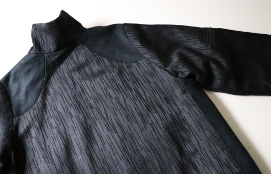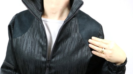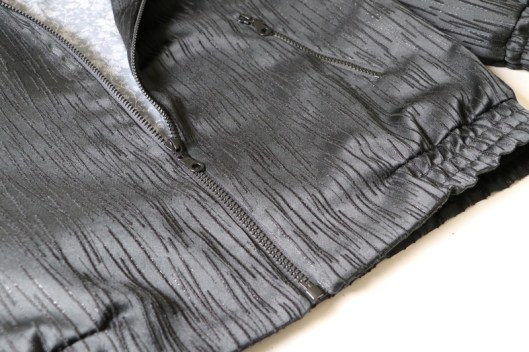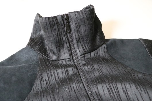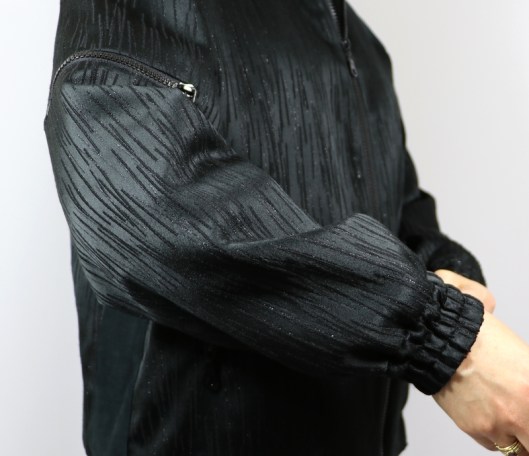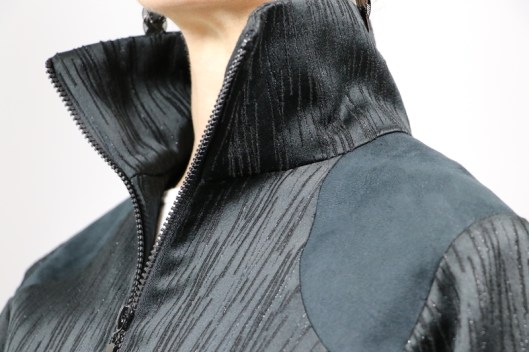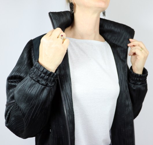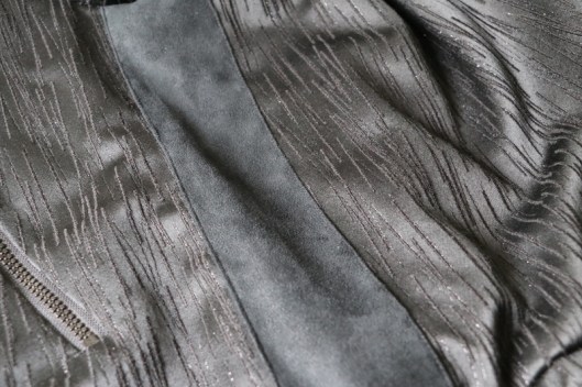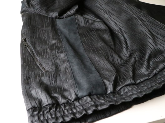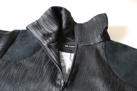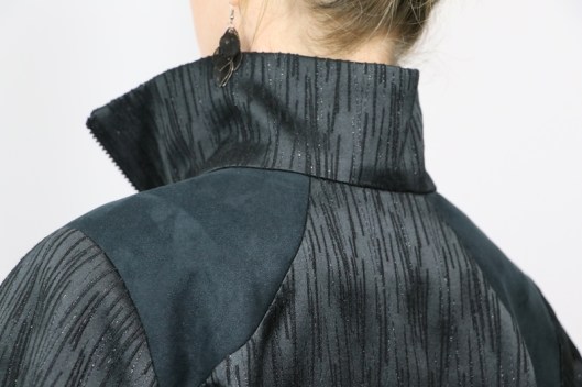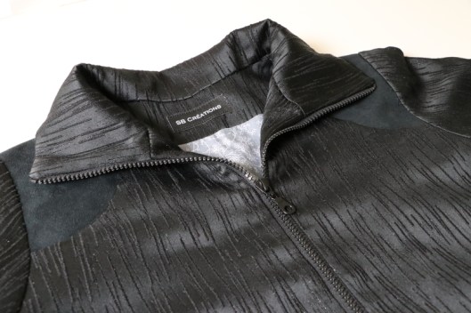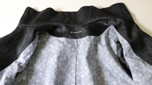 Parlons à présent tissus. A l’origine, ce patron a été conçu pour coudre un blouson en simili cuir mais la créatrice précise qu’on peut tout à fait le coudre dans un autre tissus comme le sergé, le velours milleraies, le denim, le lainage, le jacquard…. Perso, un blouson en simili cuir, ce n’est pas du tout mon style. J’ai donc opté pour Jacquard de laine satiné noir graphique que j’ai trouvé chez les coupons de Saint-Pierre. Ce coupon de 3 mètres était en promotion (22,80 € au lieu de 30 €), je n’ai donc pas hésité d’autant plus que j’aimais beaucoup la texture de ce tissu avec ce fil métallisé ! Je précise que comme j’ai cousu cette veste dans ce tissu, j’ai donc entoilé les parementures, le col et les entrées de poche, histoire de renforcer ces parties et d’obtenir un meilleur maintien.