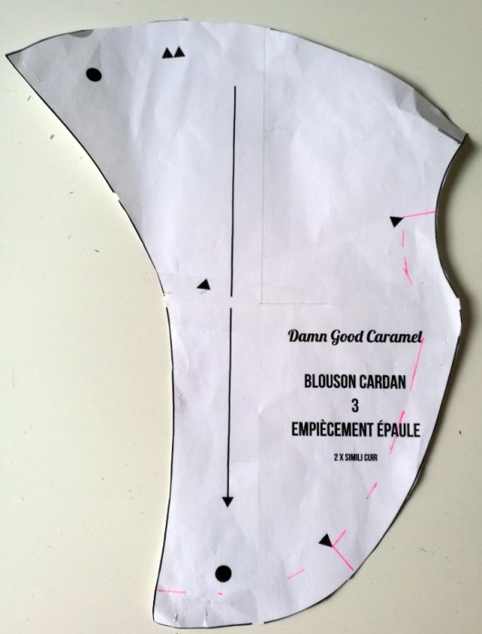 Pour les empiècements épaule, j’ai utilisé des chutes de suédine de mon stock. je n’en avais hélas pas assez pour le col, les poignets de manche et la bande de taille…