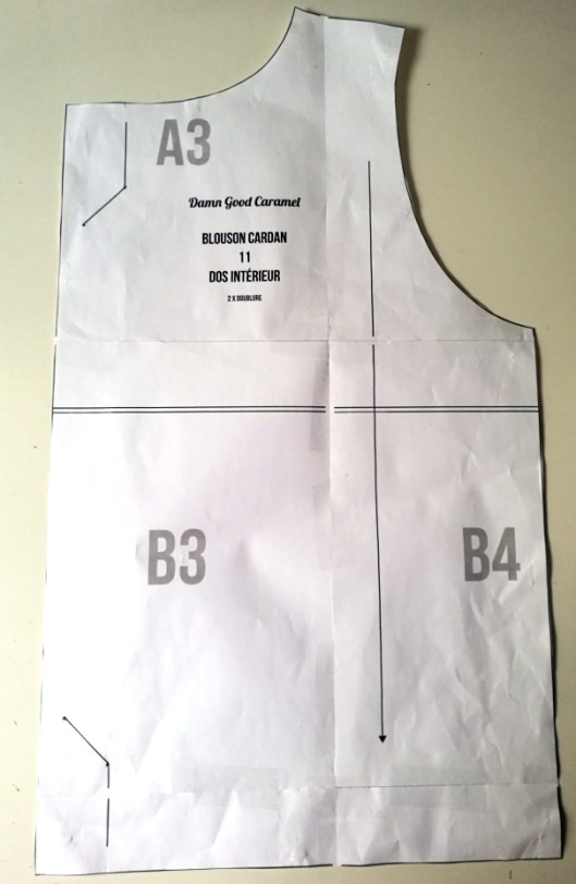 Pour info, sur la pièce 11 (doublure dos), le tracé du soufflet est indiqué mais ça aurait été bien poursuivre ce tracé pour savoir de combien est l’ouverture laissée au milieu dos. J’ai donc pour ma part laissé une ouverture de 20 cm.
