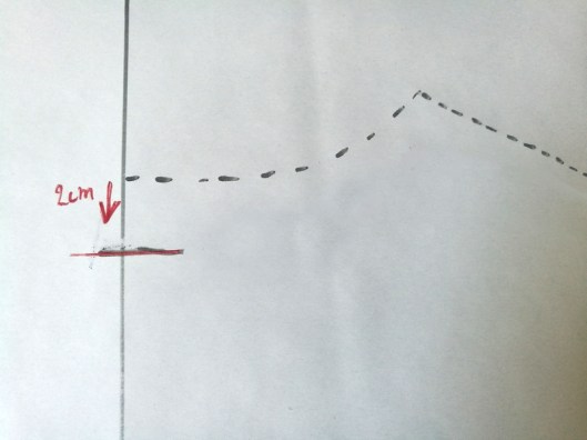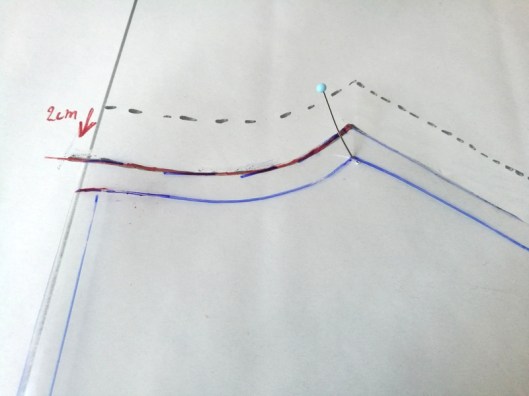 A l’essayage de la toile, on détermine le nombre de cm à retirer au milieu dos, c’est à dire le surplus de tissus. C’est difficile à mesurer quand on est seul. Pour ma part j’ai donc fait une estimation mais c’est tout de même mieux de se faire aider par quelqu’un… Dans mon cas, j’ai estimé que j’avais 2 cm en trop. Il convient donc de marquer un repère à 2 cm de l’encolure comme ci-dessous :