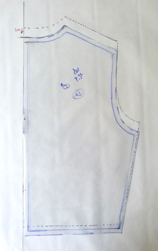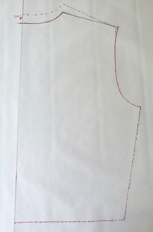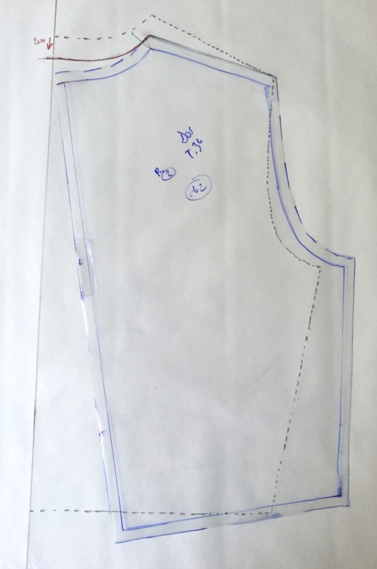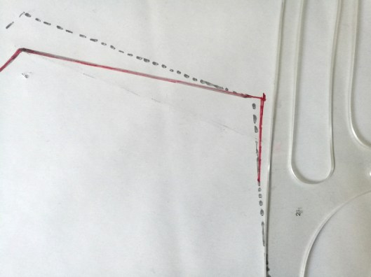 Dans mon cas, la ligne d’épaule dépasse de la précédente (celle en pointillée), j’ai donc réajuster le haut de l’emmanchure comme ci-dessous :
