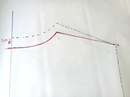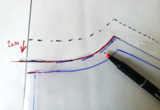 Voici ce que ça donne avant/après : en pointillé, le patron d’origine, en rouge le patron modifié !
