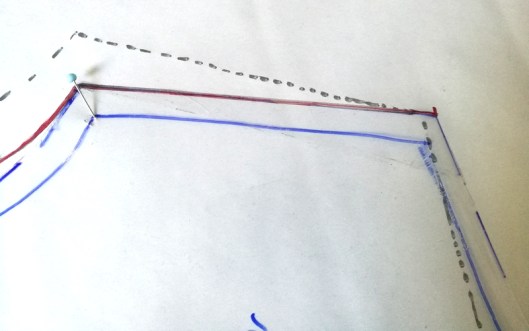 Epingle plantée, on vient tout simplement faire pivoter le patron vers la ligne d’épaule, au niveau de son extrémité (ici la pointe de la ligne en pointillée) :