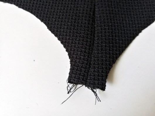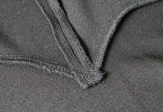 Comme annoncé plus haut, j’ai retravaillé un peu l’encolure, histoire que je puisse y passer la tête sans trop de difficultés (je rappelle que je n’ai pas d’ouverture puisque je n’ai pas cousu le zip au dos).