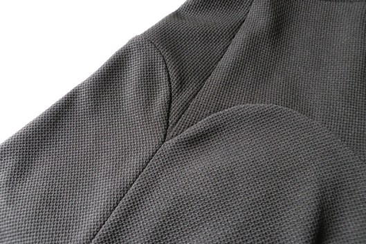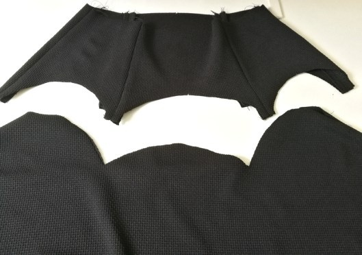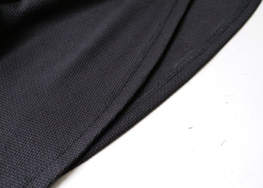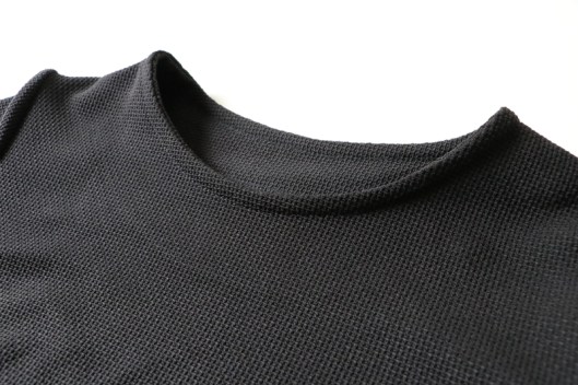 Côté tissu, le métrage nécessaire indiqué dans le livret est de 1,70m de tissu en 1,40 m de large. Tissus conseillés : velours, viscose, soie, coton fluide, crêpe. Je n’ai pas du tout suivi ces recommandations : j’ai pour ma part préféré opter pour du jersey texturé noir d’épaisseur moyenne que j’ai acheté chez Modes & travaux (coupons de Saint-Pierre) : 15€ les 3 mètres.