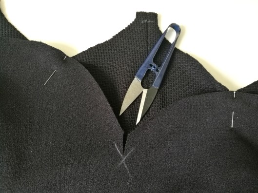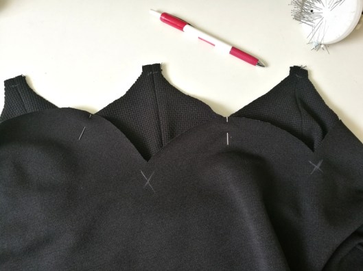 2/ l’assemblage des empiècements en pointe sur la jupe demande une sacrée précision ! Pour savoir comment coudre de beaux angles, c’est par ici ! Il faut en effet que les angles soit parfaits et que les coutures s’alignent parfaitement. Chose que je trouve très très délicate ici car l’empiècement est qui plus est en courbe ! Il faut donc assembler des courbes convexes et concaves entre elles, ce qui accentue la difficulté… C’est pour cette raison que j’ai préféré ajouter sur le patronage des crans de montage au niveau des arrondis. J’ai également tracé à la craie les repères d’assemblage à 1 cm sur le tissu (mais ça c’est prévu dans les instructions).
