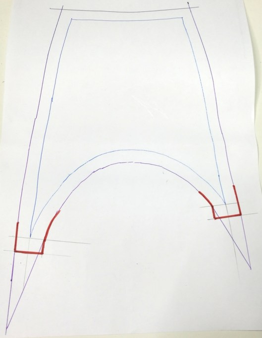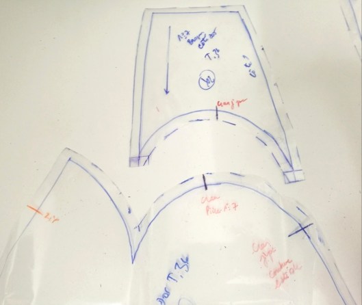 Autre précision qui a son importance : les valeurs de couture ne sont pas incluses. Il est conseillé dans le livret d’ajouter des valeurs de couture de 1 cm, ce que j’ai fait. Pour faciliter l’assemblage des pièces qui relèvent de l’empiècement devant et dos, j’ai préféré tracer le talon à l’équerre au niveau des pointes. C’est tellement plus précis et plus facile à assembler par la suite !