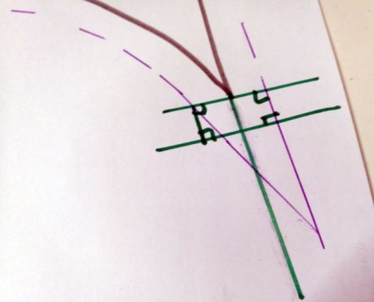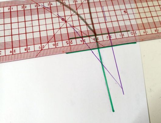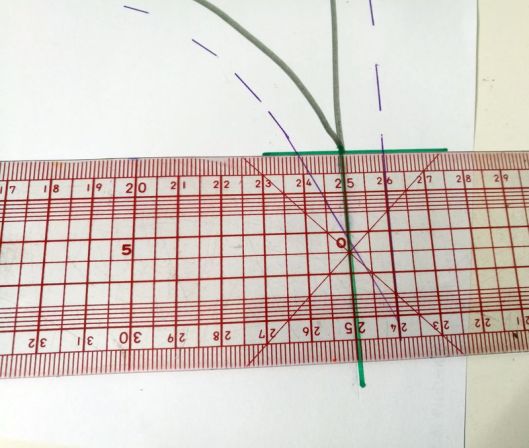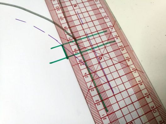 5/ tracer une seconde parallèle à 1 cm : un point d’intersection touche la ligne de la valeur de couture :