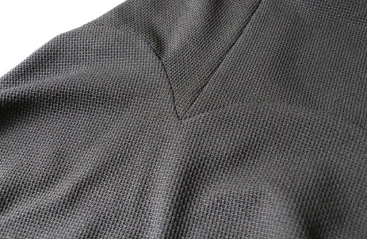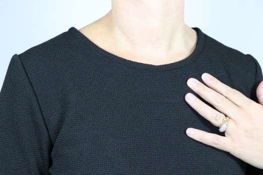 Côté finitions, il est proposé de coudre une bande de propreté pour finir l’encolure. J’ai préféré opter pour un parementure que j’ai fixée à l’encolure par une surpiqûre visible (réalisée à la recouvreuse), histoire qu’elle reste bien en place.