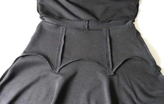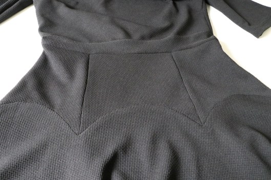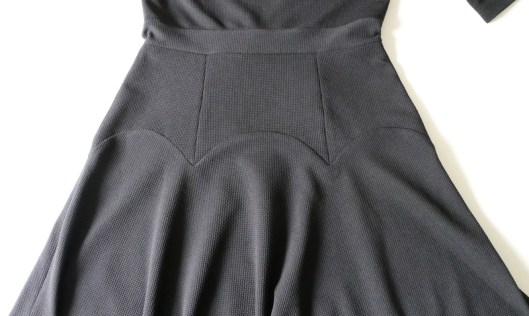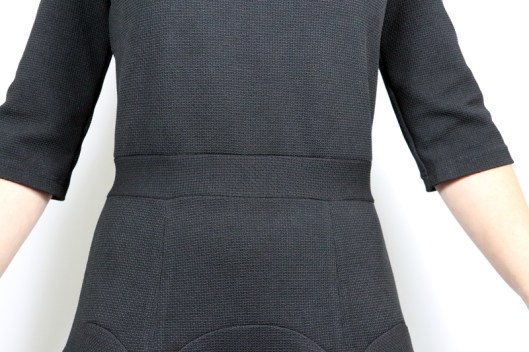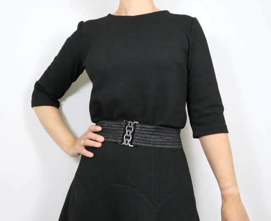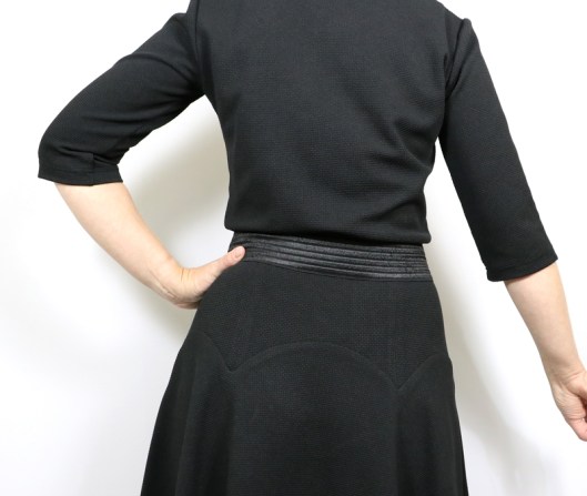 Le seul problème du coup, c’est que je suis obligée de porter une ceinture du commerce pour faire blouser le corsage. Le fait que ce soit en jersey, du coup, vu le poids de la partie jupe, la ceinture de la robe ne reste pas en place, elle est tirée vers le bas…