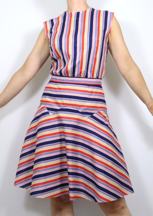 Autre précision : j’ai assemblé quasiment toute la robe au point triple de la machine à coudre et j’ai surjeté les bords. Il faut en effet, à plusieurs endroits, ouvrir les coutures et les presser au fer, ce que j’ai donc fait. Et puis de toute façon, pour être précis dans l’assemblage, il me semblait plus simple de tout assembler à la machine à coudre plutôt qu’à la surjeteuse…