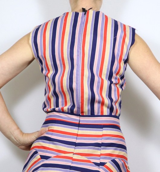Ce choix de tissu était un peu risqué mais je suis au final ravie du résultat ! Le fait d’avoir choisi ce tissu m’a ainsi permis de ne pas mettre le zip invisible de 60 cm prévu au dos. Perso, je n’aime pas les zips au dos, je trouve ça des plus inesthétiques… Donc pas de couture au milieu dos, j’ai mis toutes les pièces au pli du tissu !