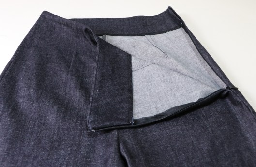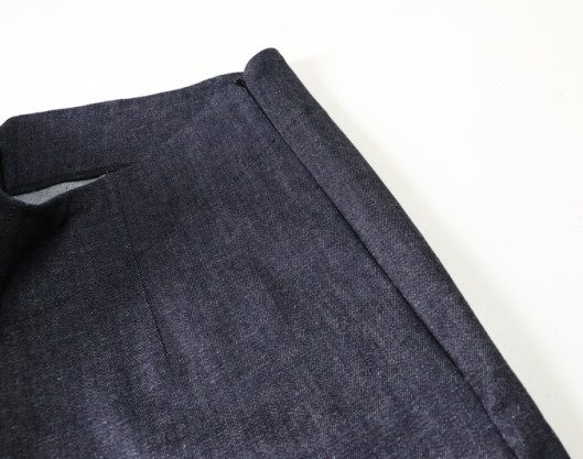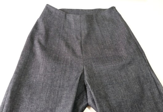 A noter que c’est un pantalon taille haute, voire très haute ! Quand je le porte, la pointe du V arrive au niveau de mon nombril, les côtés et le dos arrivent donc bien plus haut. Je rappelle que la parementure est entoilée, il n’y a donc plus du tout d’élasticité à ce niveau-là. Résultat : au porté ça compresse, ce n’est donc pas très agréable, pas très confortable…