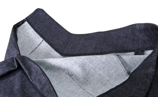 En ce qui concerne la finition des bords, le patron prévoit des parementures devant & dos. Celles-ci sont entoilées. J’ai suivi les instructions : j’ai effectué une sous-piqûre et cranté la pointe du V.