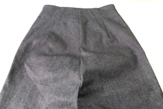 Le haut du pantalon est cintré par des pinces de taille devant et dos. Le devant a une découpe en V assez prononcée.