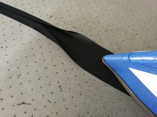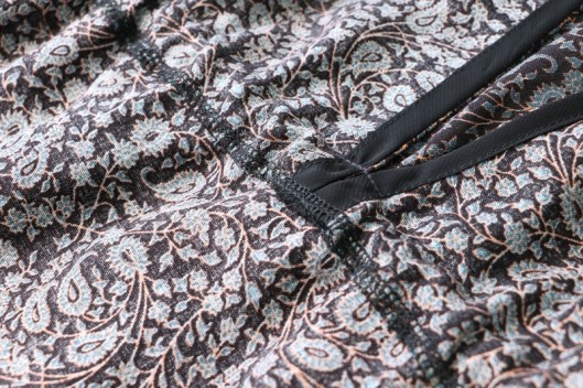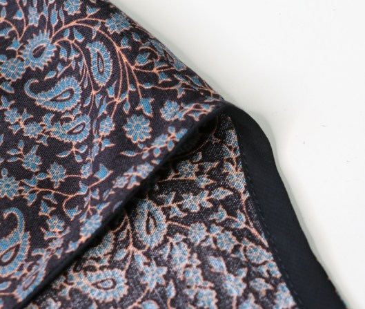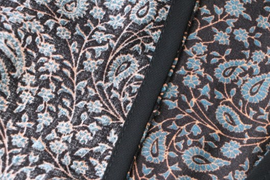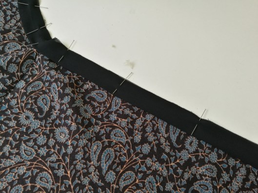 En revanche, ce biais n’a pas été coupé dans le bais mais plutôt dans le droit-fil : du coup il n’y a aucune élasticité/souplesse ce qui peut poser problème pour les courbes très prononcées. Dans le cas présent, pas de souci, j’ai pu le fixer sans encombre, même au niveau de l’encolure dos où c’est tout de même arrondi.
