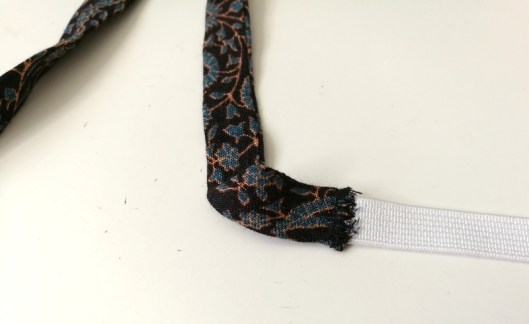 Pour le lien à nouer, j’ai fait comme pour la dernière fois : un mix élastique/tissu.