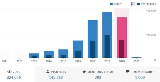 En totalité, mon blog comptabilise 1 291 945 visites depuis février 2013 : on a dépassé le million !!! Je n’en reviens tout simplement pas ! Ca représente une moyenne de 888 visites par jour (1017 en 2018). Même si le chiffre est en baisse, je le trouve malgré tout incroyable !