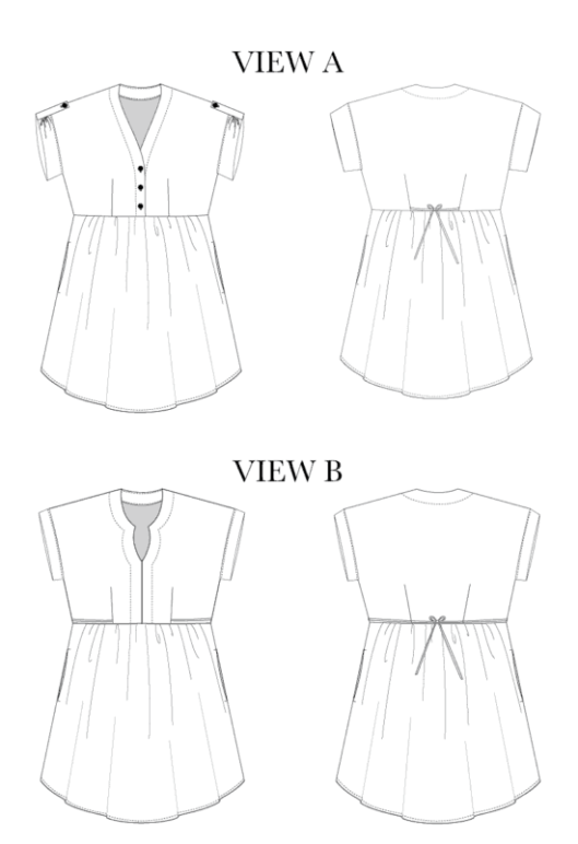 Voici donc ma 3ème version de La robe et/ou blouse Fringe de Chalk & Notch patterns. J’aime beaucoup porter ce modèle été comme hiver (d’où le sous-pull col roulé !). Il s’agit à la base d’une robe ou d’une blouse semi-ajustée avec jupe froncée de forme liquette. Pour le corsage, deux décolletés en V sont proposés :