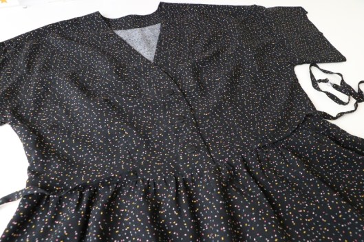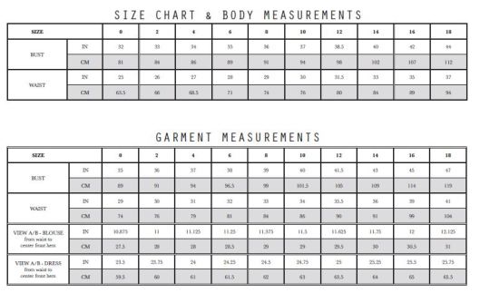 Question tailles, le patron est proposé de la taille 0 à 18. Bonne nouvelle : il y a un tableau avec les mesures finies du vêtement, ce qui donne une bonne idée de l’aisance apportée au modèle. Pour ma part je me suis fiée au tableau des tailles et j’ai pris la taille 2 qui correspond à mon tour de poitrine. Le résultat est impeccable, la robe est ample juste comme il faut, j’en suis ravie.