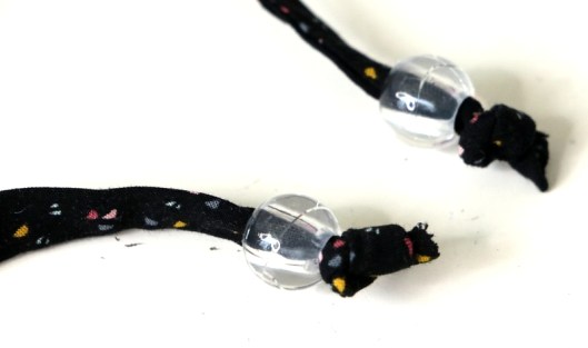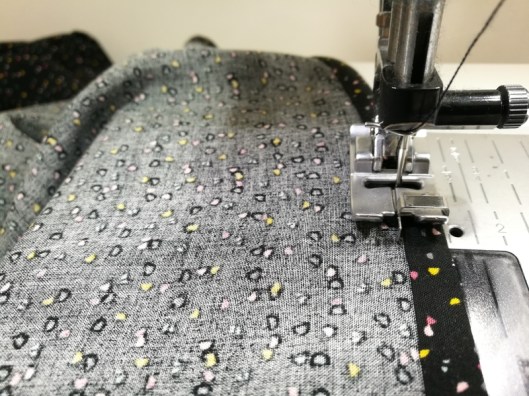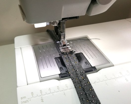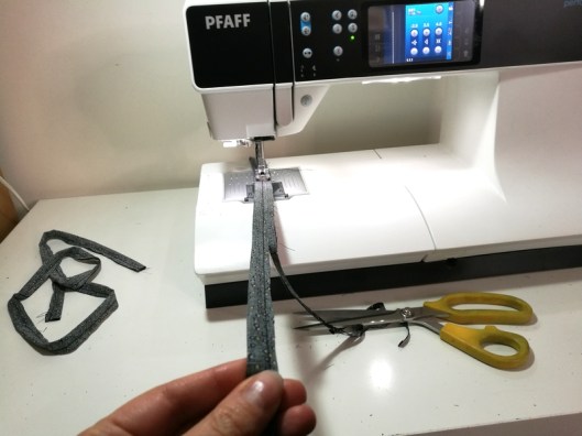 Ces liens, ce sont en fait de grandes bandes qu’on plie endroit contre endroit et qu’on coud. Il faut ensuite recouper les marges de moitié avant de retourner les bandes sur l’endroit. Pour ce faire, j’ai placé ma bande sous le pied de biche de ma machine : le tissu est ainsi tendu et ça facilite donc la découpe. C’est comme une 3ème main !