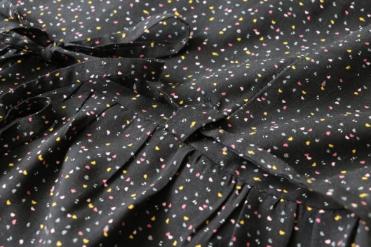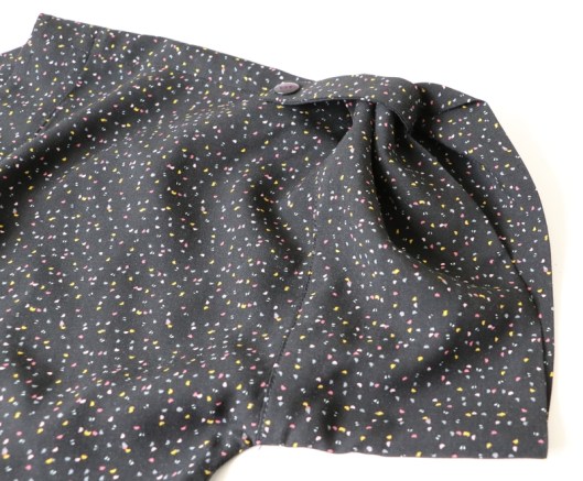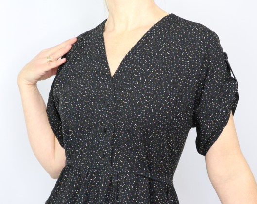 Question tissu, il est conseillé de choisir un tissu fin à moyen ayant un joli drapé comme de la viscose, du lin, du voile de coton, du chambray… Mes deux précédentes versions avaient cousues dans une cotonnade et j’aimais bien malgré tout le rendu ! Pour ma 3ème version, j’ai choisi une viscose qui donne c’est vrai un tombé plus souple/fluide. Je l’ai acheté chez Diffuslaine Tissus à Saint-Nazaire au prix de 9,90€.