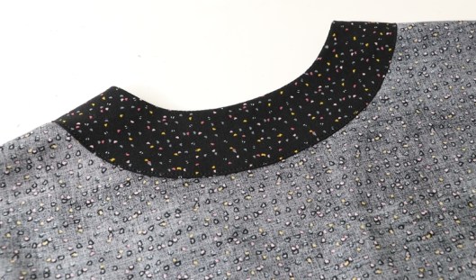Les finitions de cette encolure est des plus soignées : il s’agit d’une parementure dont les bords sont ourlés puis fixés par une piqûre nervure. La parementure ainsi ne bouge pas, elle reste bien en place.
