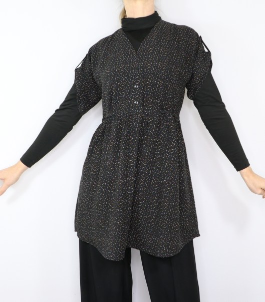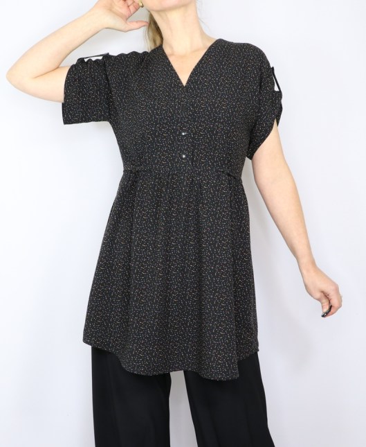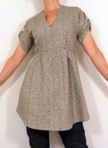 Pour cette troisième version, j’ai opté pour la blouse avec boutonnage au devant, manches retroussées par une patte de boutonnage et liens à nouer. La seule modification que j’ai faite, c’est que j’ai allongé la blouse de 15 cm afin d’obtenir une tunique.