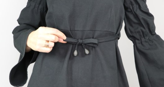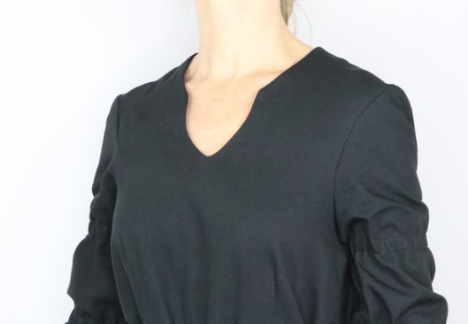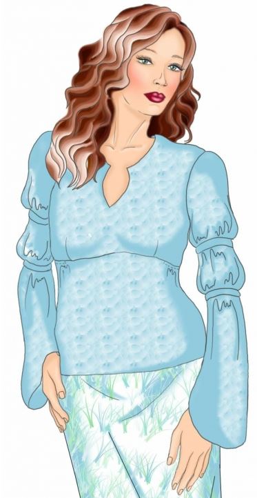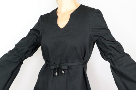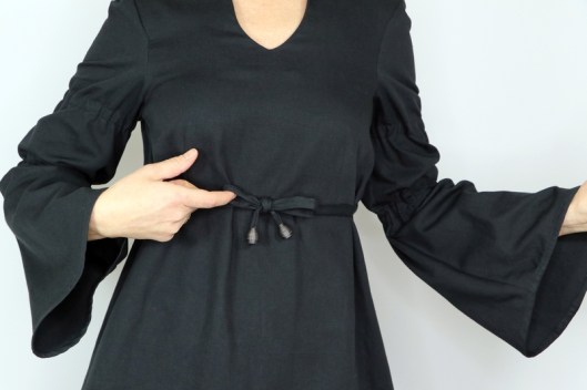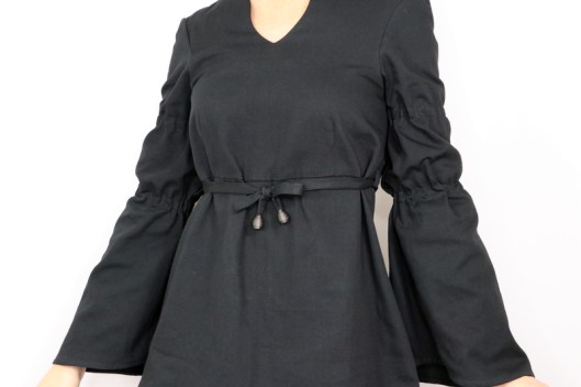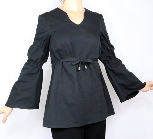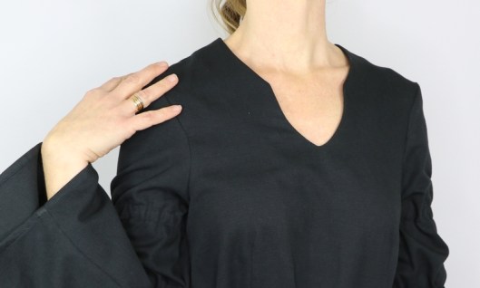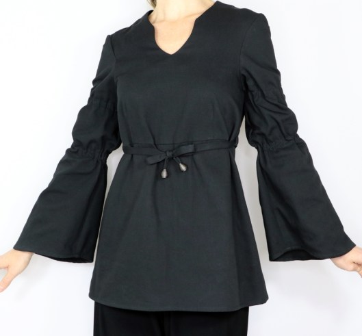 Il s’agit du modèle n°5436, une tunique à encolure tunisienne avec découpe sous poitrine et manches longues évasées resserrées aux biceps par des coulisses élastiquées. La tunique se ferme au dos par un zip invisible.