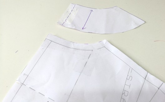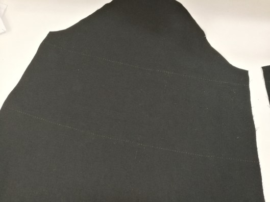 J’ai donc cousu un biais sur les lignes indiquées sur la pièce patron. Pour marquer ces lignes sur l’envers des manches, j’ai utilisé roulette et papier carbone :