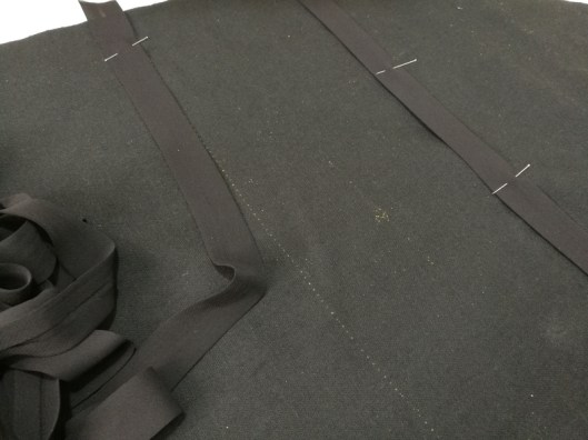 J’ai ensuite créer les coulisses. Pour ce faire j’ai pris ce que j’avais dans mon stock, à savoir du biais en voile (un peu trop fin pour ce projet mais tant pis…). J’ai ensuite surpiqué les deux bords du biais.