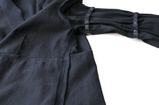 Pour les élastiques des manches, les explications étant plus que nébuleuses, j’ai préféré faire à ma manière en cousant des coulisses élastiquées. J’ai utilisé la même méthode que pour ma blouse Burda :