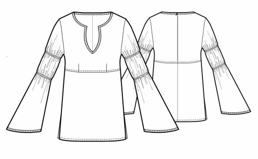 Il s’agit du modèle n°5436, une tunique à encolure tunisienne avec découpe sous poitrine et manches longues évasées resserrées aux biceps par des coulisses élastiquées. La tunique se ferme au dos par un zip invisible.