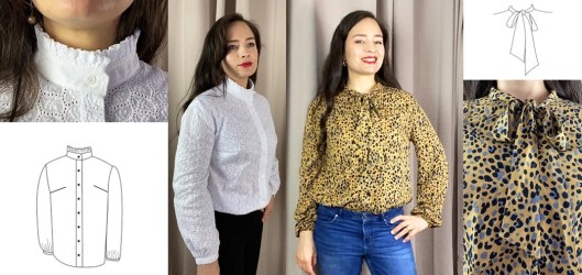Les deux autres déclinaisons de ce patron sont le chemisier à col lavallière et le chemisier à col victorien, tous deux proposés avec un dos sans empiècement et manches bouffantes resserrées au poignet par des bracelets de manche :