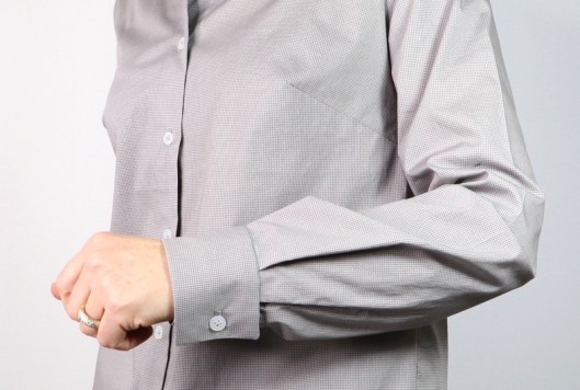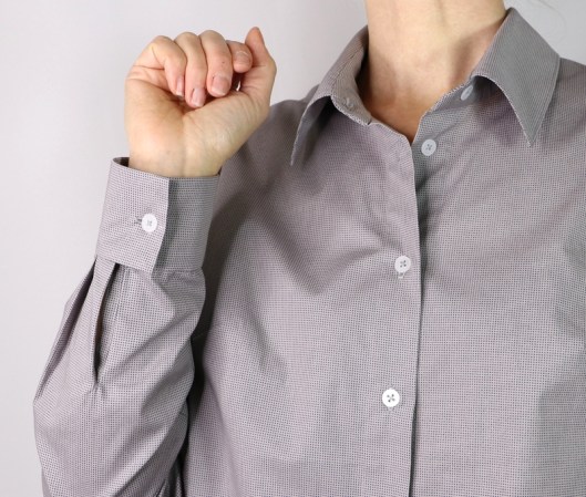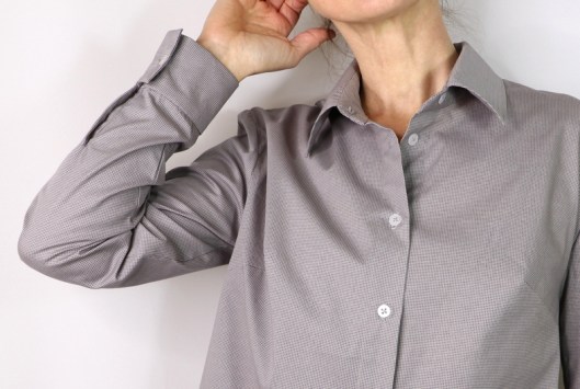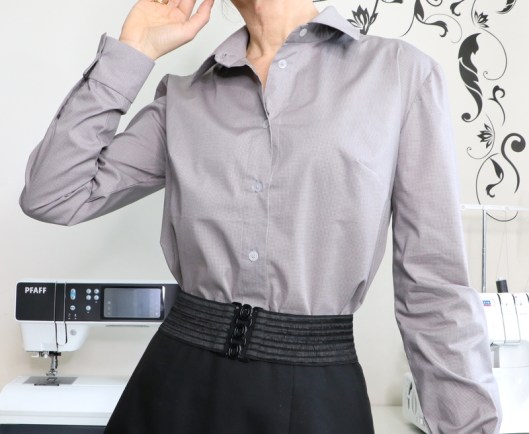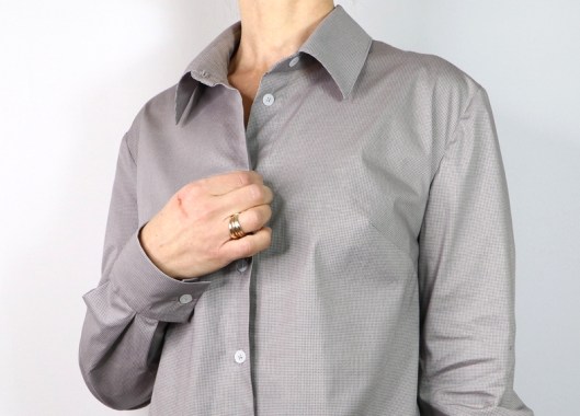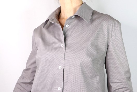 J’ai cousu ma chemise dans une cotonnade grise achetée aux Coupons de Saint-Pierre (boutique Modes & travaux) : 15€ les 3 mètres. C’est un achat que je regrette un peu car ce tissu se froisse énormément. Le rendu n’est donc pas des meilleurs et je n’ose imaginer ce qu’elle donnera après une journée de travail… Le métrage nécessaire pour coudre cette version chemise est 2 mètres.