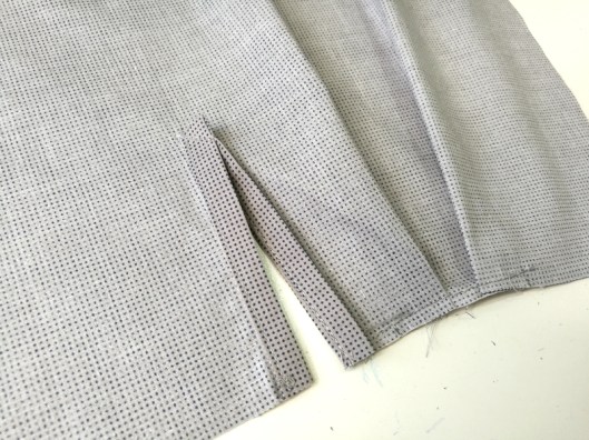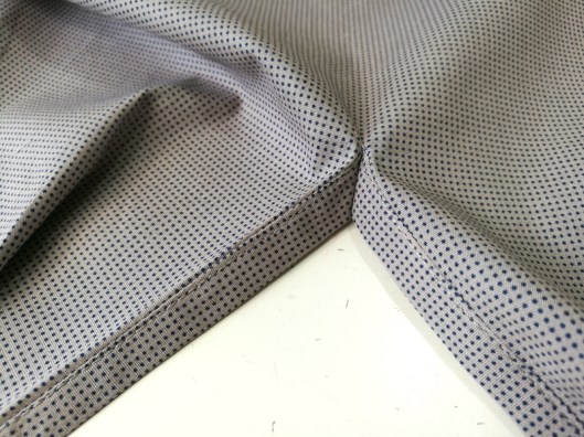 Une vue de l’ourlet (double rentré) et de la couture des côtés de la chemise :