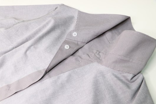 La chemise se ferme au milieu devant par une patte de boutonnage. Il s’agit d’une patte à même et non d’une patte rapportée. Perso, je préfère les chemises qui sont patronnées de cette manière car je trouve la réalisation plus simple et rapide à faire. Alors c’est sûr qu’avec une patte de boutonnage à même, on ne peut ni jouer sur les matières ni sur les couleurs mais moi, perso je préfère nettement.