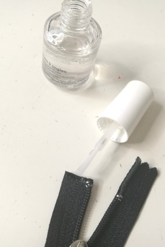 Il est recommandé d’utiliser la colle à tissu ou du Fray check sur l’extrémité du zip coupé afin que le bord coupé ne s’effiloche pas. Comme je n’avais ni l’un ni l’autre, je vous donne mon astuce : utiliser du vernis à ongle transparent !
