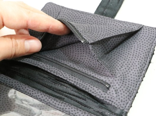 Une fois les poches transparentes cousues, il faut les retourner sur l’endroit et là aussi attention, lors du retournement de ne pas abimer le plastique…