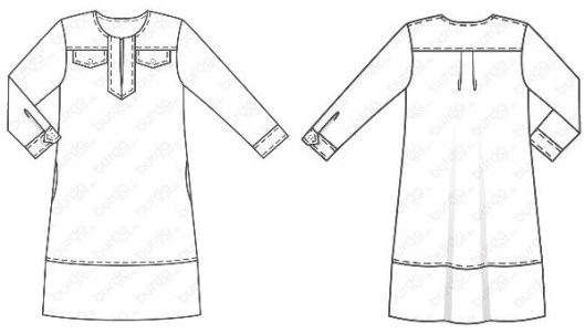 Burda appelle ça une robe polo même si pour moi la robe polo c’est autre chose… Mais bon… Ce modèle est proposé en top ou en robe avec encolure tunisienne. Empiècements devant et dos. Rabats de poche au devant. Les manches 3/4 sont finies par un poignet de manche boutonné. La robe dispose de poches prises dans la couture et est ceinturée à la taille. Voici le schéma technique :